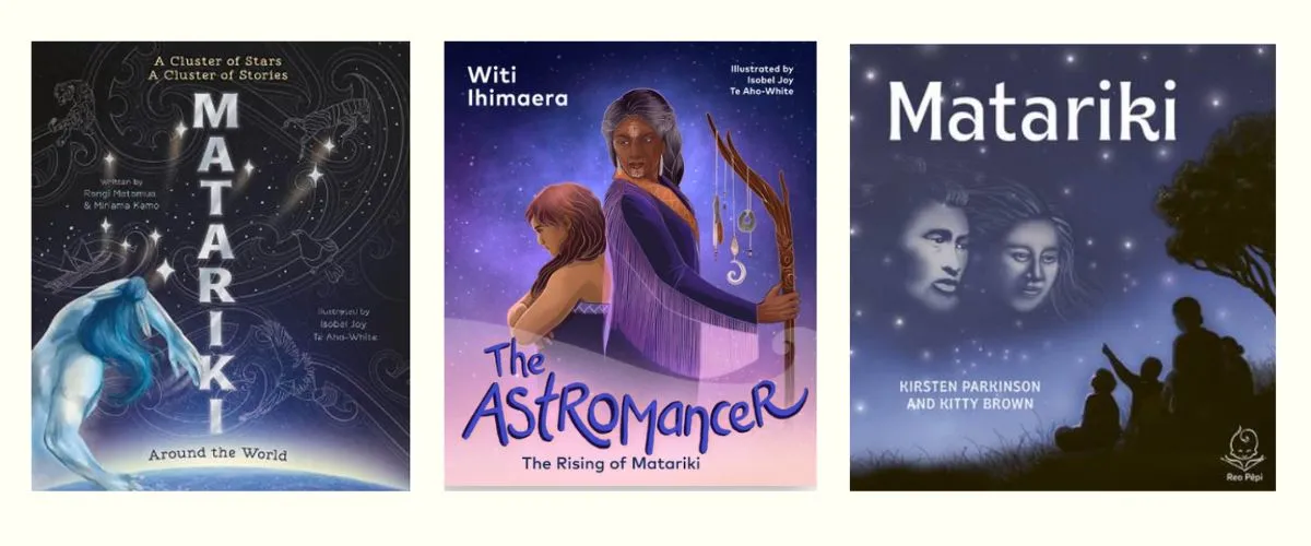 Matariki Around the World: A cluster of stars and cluster of stories by Miriama Kamo and Rangi Mātāmua. A new activity book has also been released in 2024 to sit alongside this pukapuka: My Matariki Colouring and Activity Book